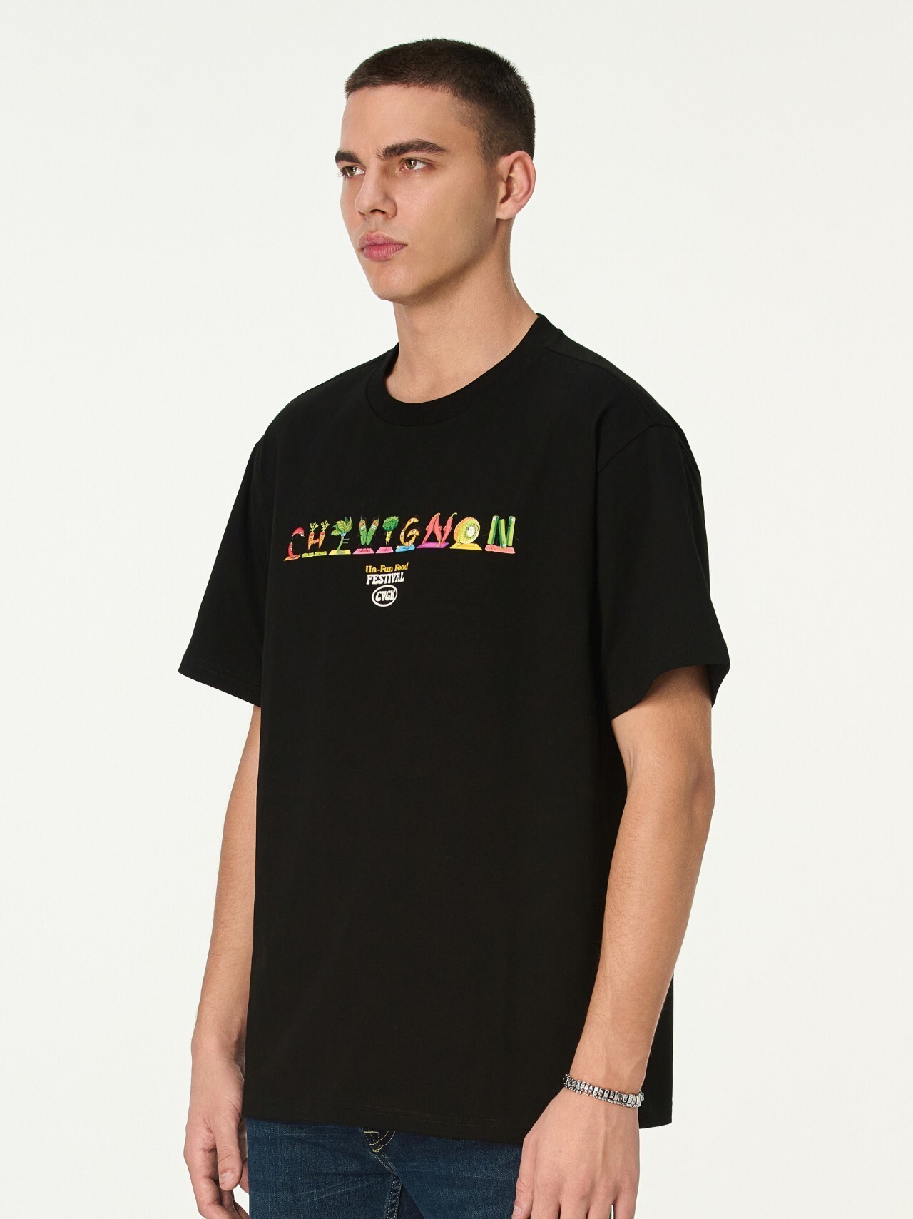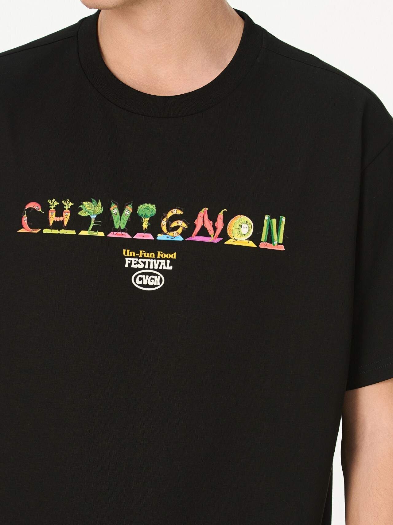This shirt features a playful design where each letter transforms into a fruit or plant, celebrating a "Fun Food Festival" theme. Crafted from cooling fabric, it offers a relaxed fit ideal for casual summer wear.