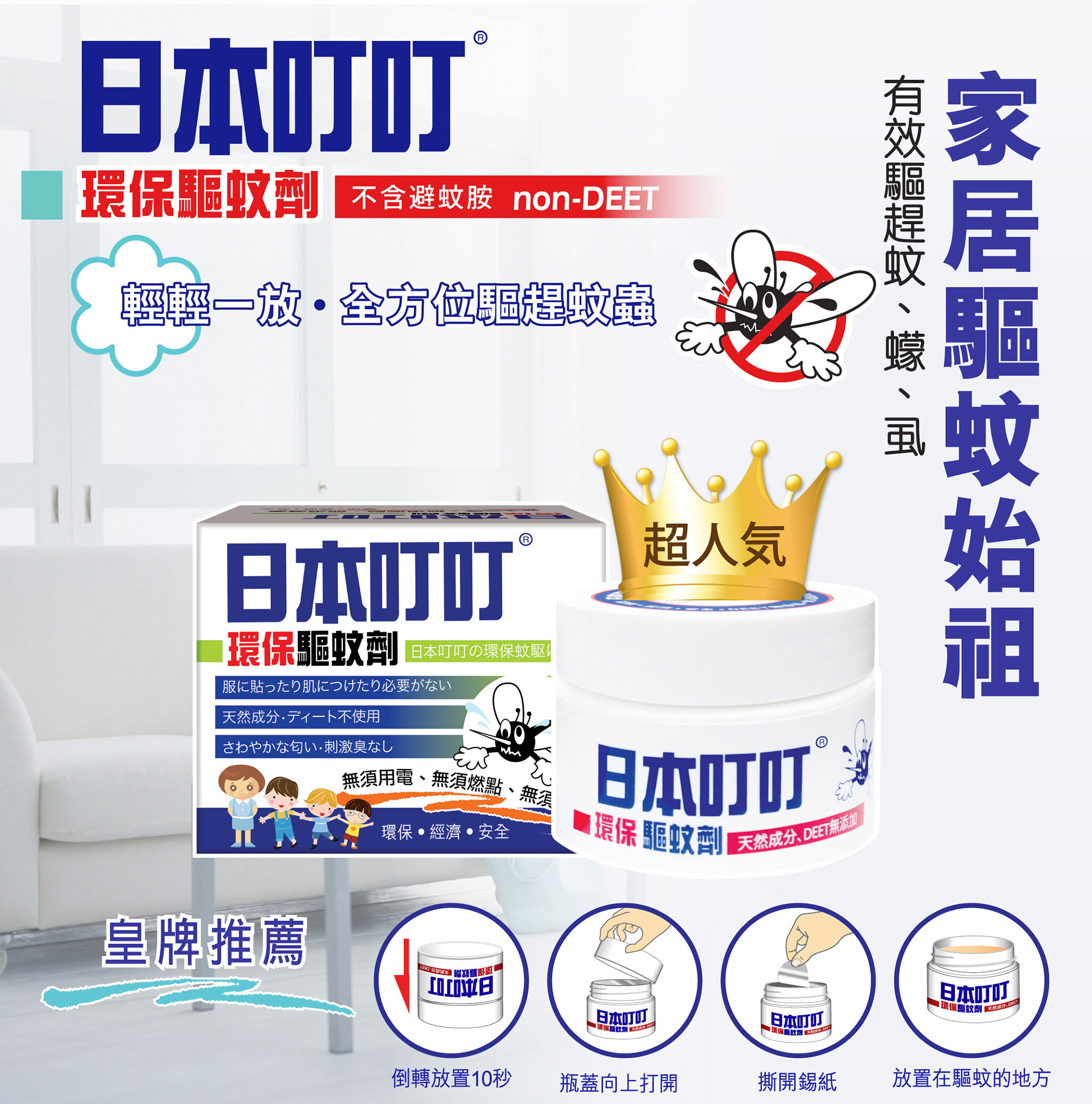 This product is made from Natural Citronella Oil ingredient and developed on the natural mosquito repelling concept of coil incense. It requires no electricity, lighting, or spraying at all