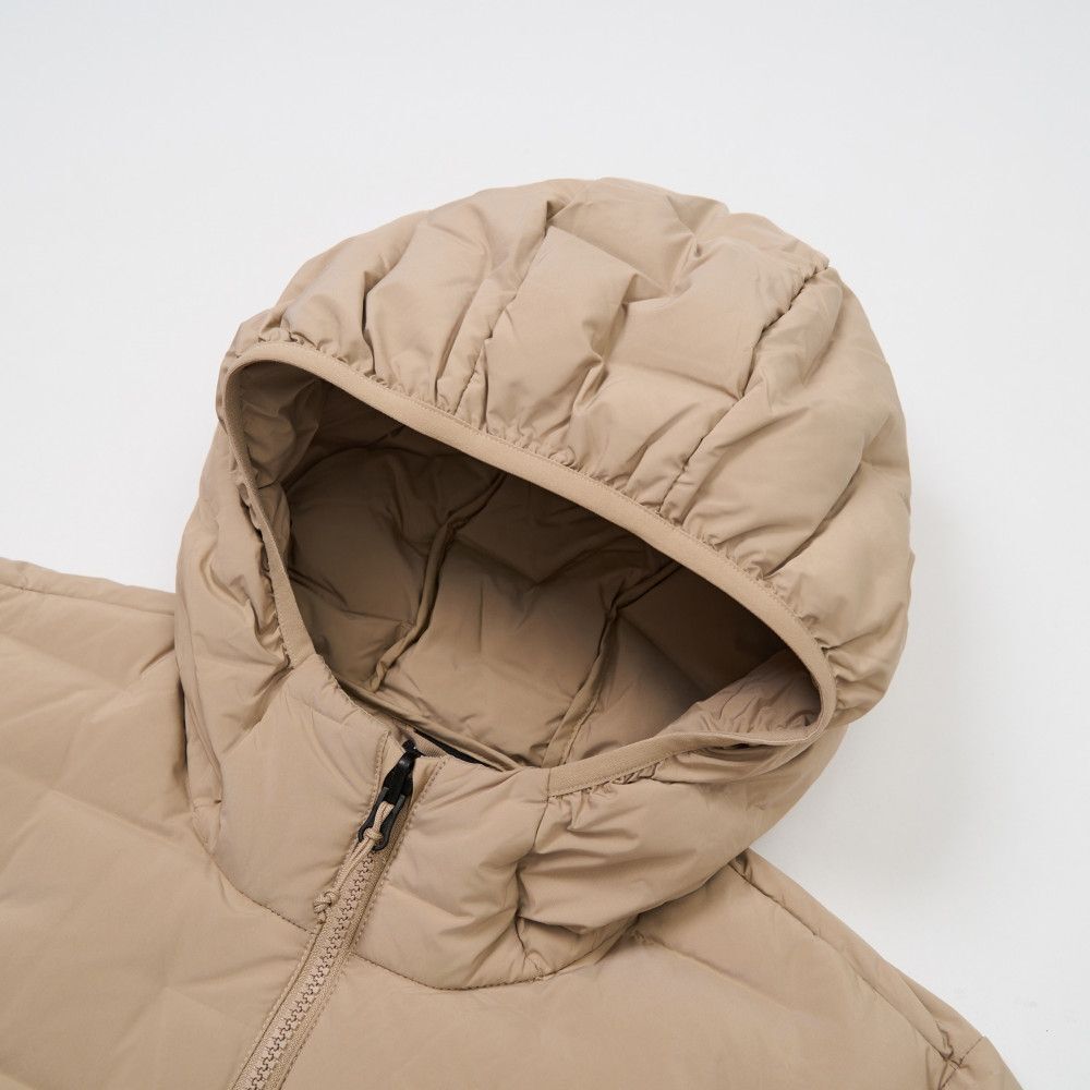 採用立方體隔絎設計的超輕量男裝連帽羽絨外套,在極簡收納中提供高效保暖。