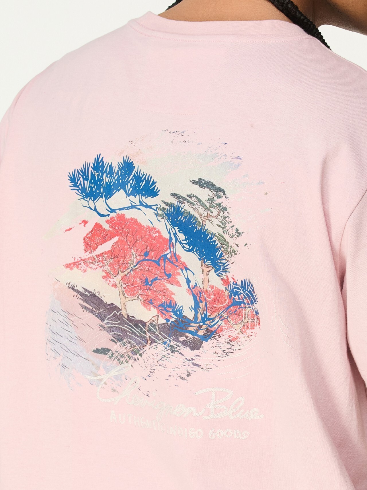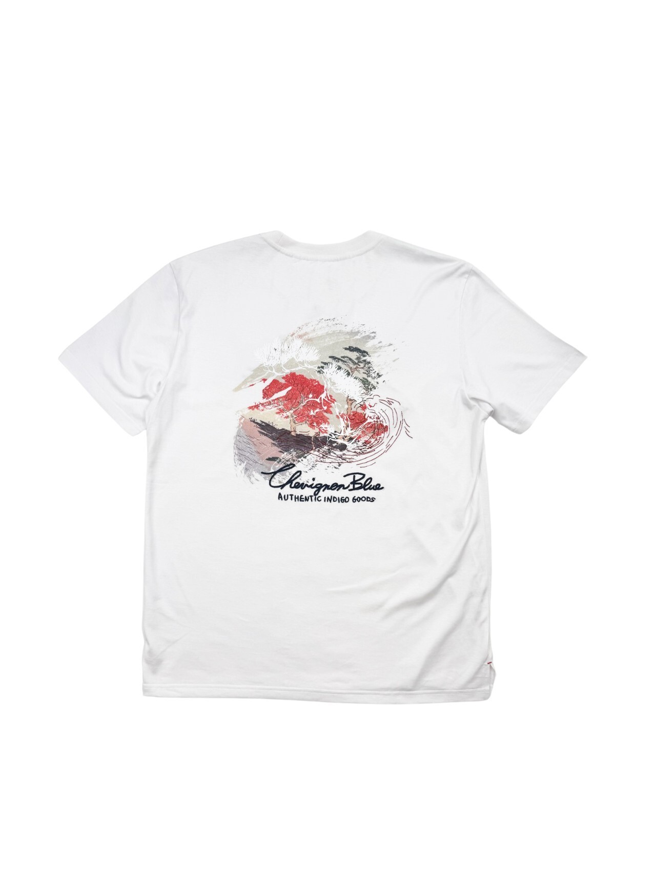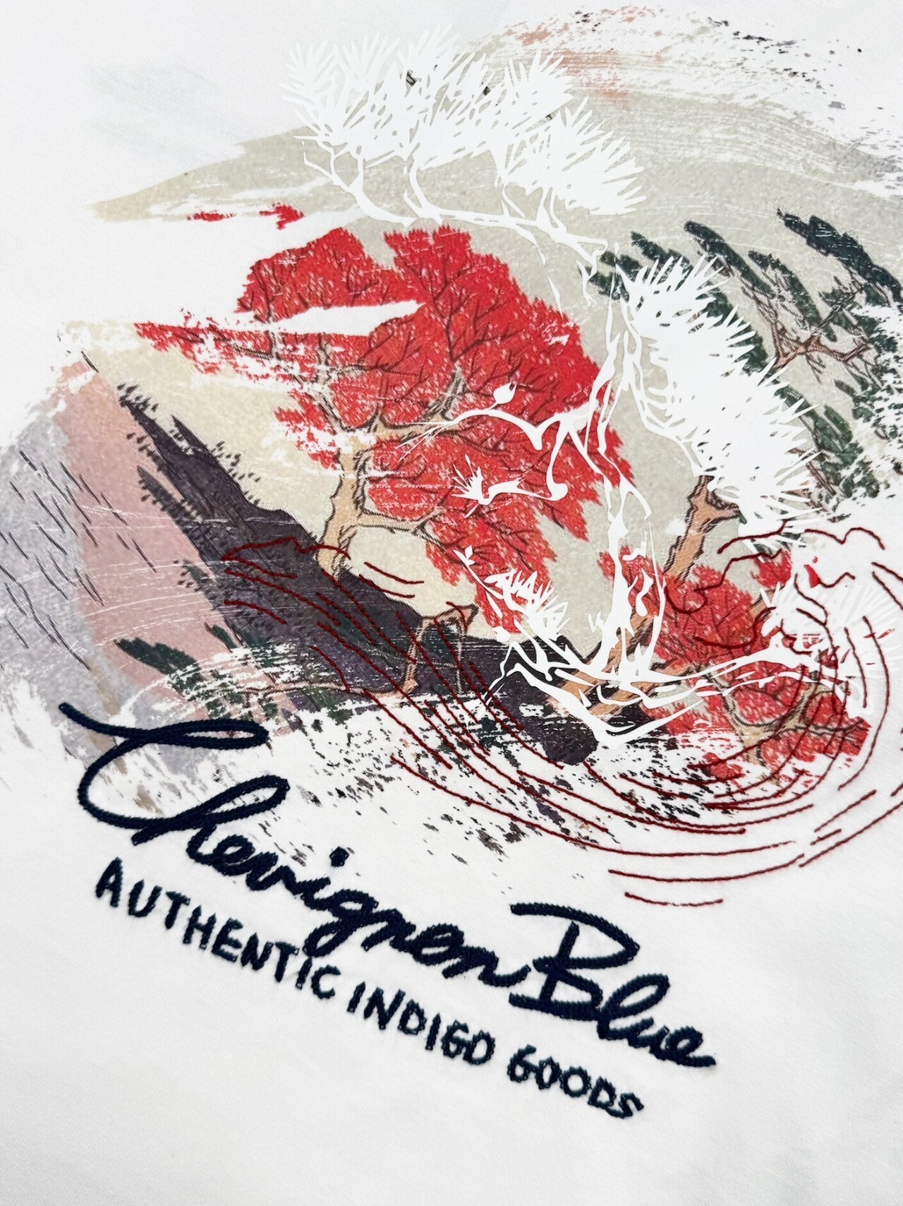 這款襯衫展示了引人注目的波浪藝術圖案,使用白色、紅色和黑色的筆觸表現。裝飾邊框內包含松樹剪影,增強設計的對比和視覺吸引力。