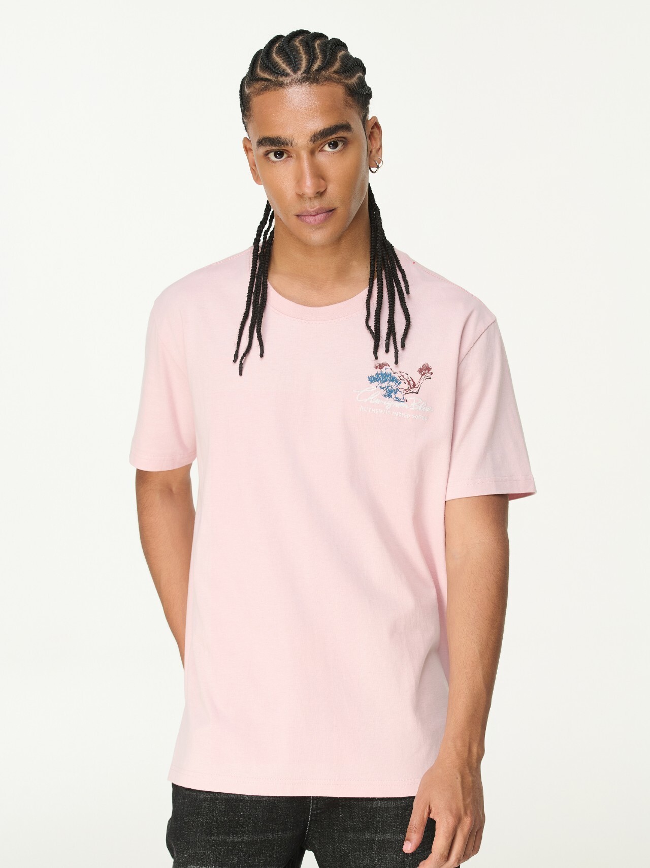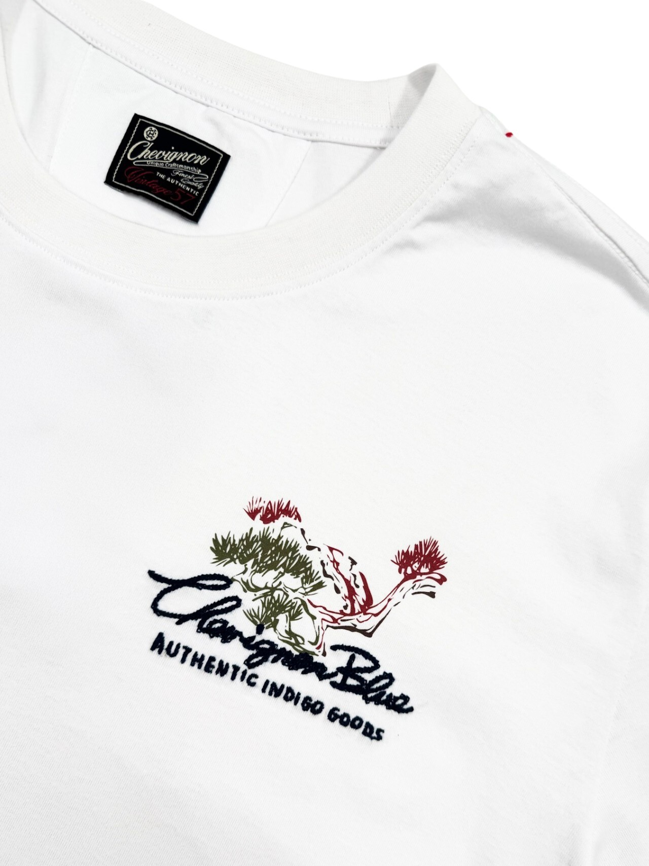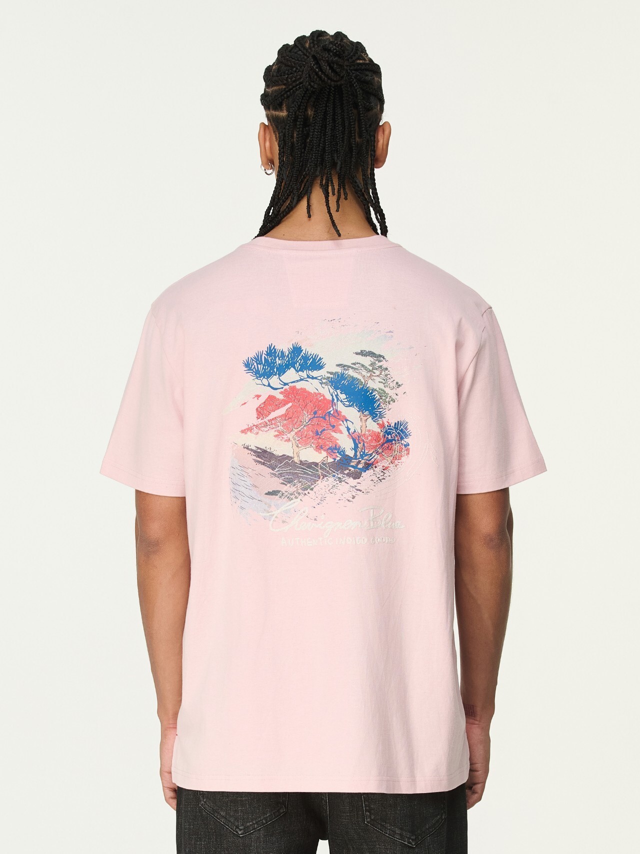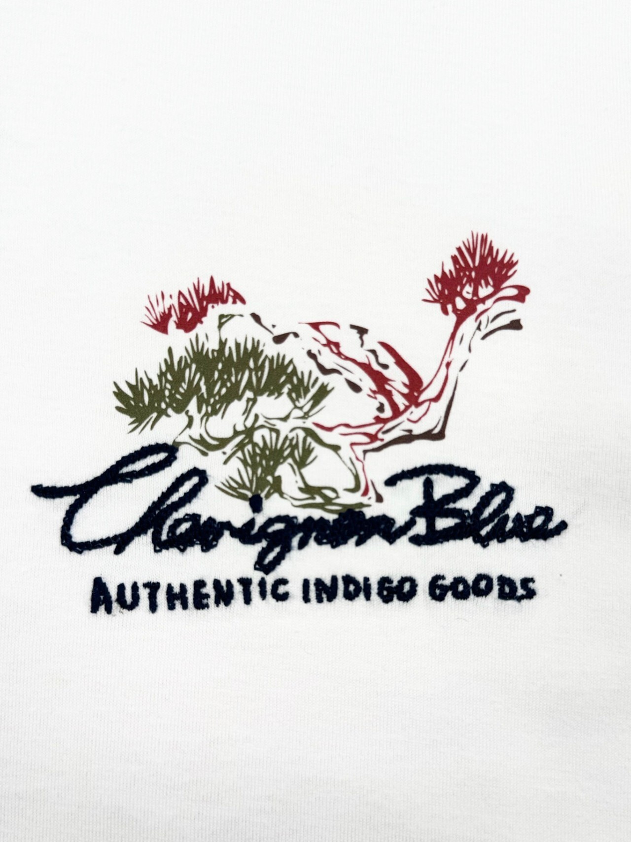 這款襯衫展示了引人注目的波浪藝術圖案,使用白色、紅色和黑色的筆觸表現。裝飾邊框內包含松樹剪影,增強設計的對比和視覺吸引力。